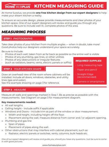 Measuring your kitchen just got easier! We created this handy measuring guide to assist you in gathering all the required information for us to complete your free kitchen layout. It’s quicker than you think.